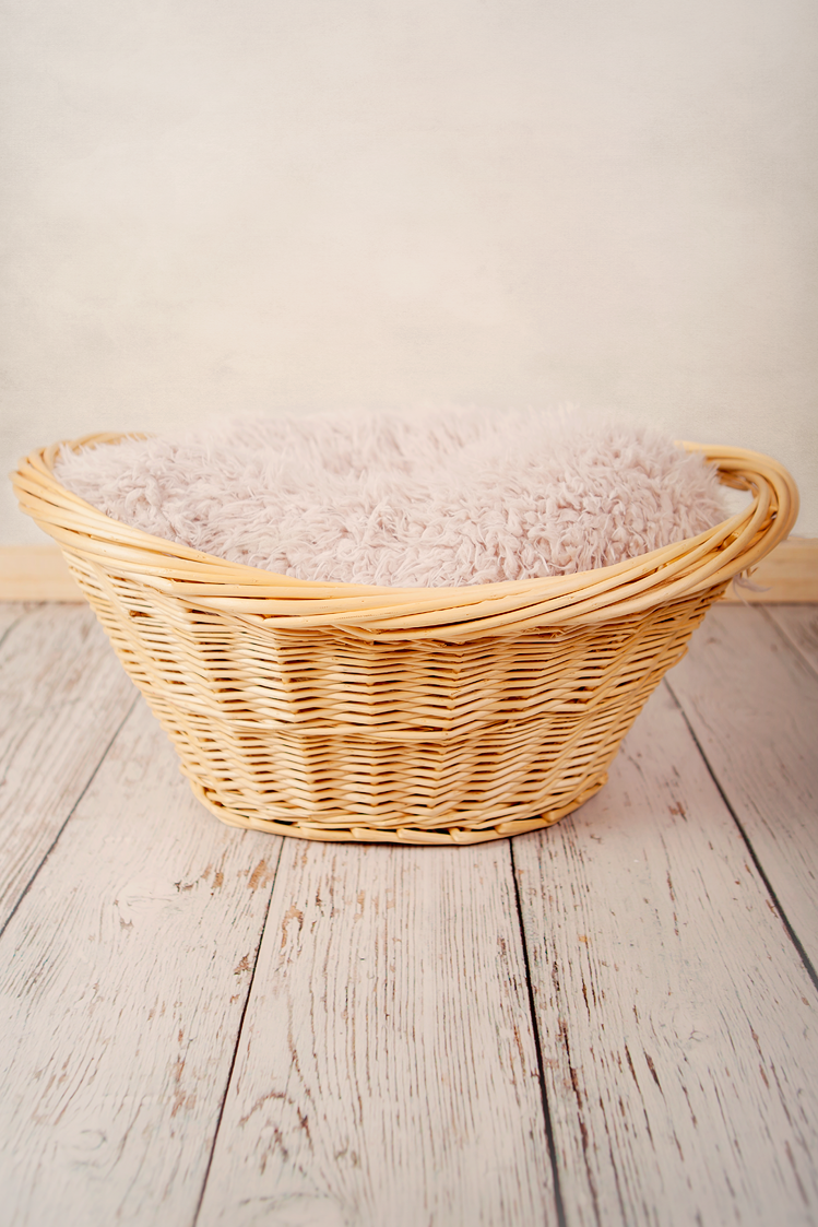 Digital Backdrop, white wooden floor and baby basket with fluffy fur.